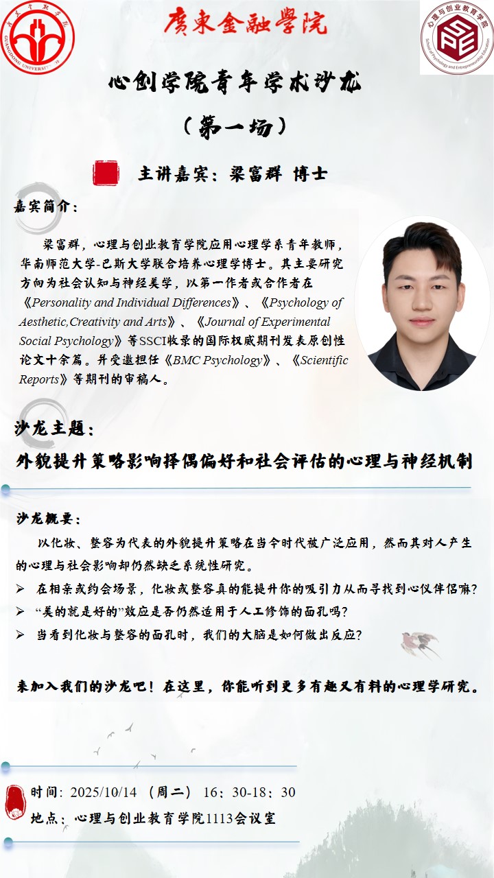10 月 14 日下午,心理与suncitygroup太阳新城 1113 会议室里座无虚席,广金心理与suncitygroup太阳新城青年学术沙龙(第一场) 在此顺利举办。本次沙龙邀请到应用心理学系青年教师梁富群博士主讲,围绕 “外貌提升策略影响择偶偏好和社会评估的心理与神经机制” 展开深度分享,带现场师生走进了一场兼具科学性与趣味性的心理学探索之旅。