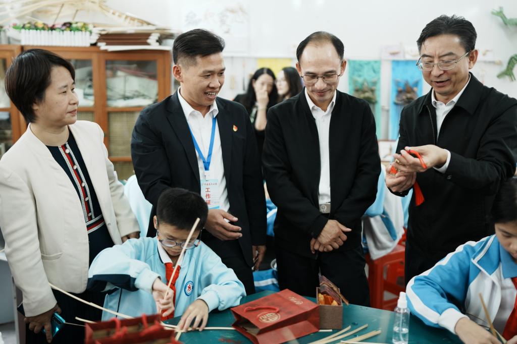 随后,大家前往广宁县第六小学,现场观摩小员工竹编课程,并参观了小员工竹编作品展示。